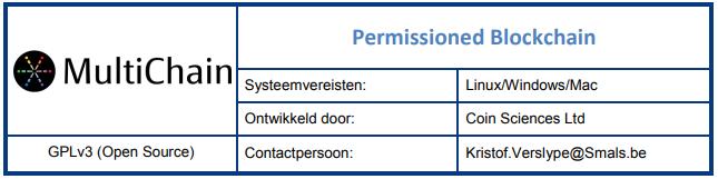 MultiChain is een blockchain technologie die toelaat om zelf permissioned (afgeschermde, private) blockchain netwerken op te zetten, te beheren en erin te participeren. MultiChain laat toe om snel tot concrete resultaten te komen en is bovendien vrij efficiënt. Anderzijds mankeert het meer geavanceerde features zoals ondersteuning voor smart contracts.