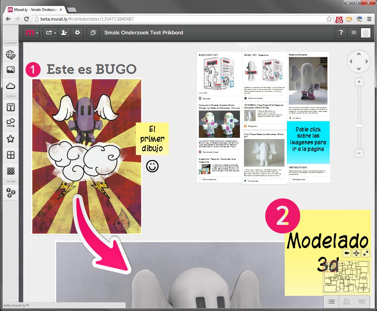 Murally is een nieuwe speler in het veld en is momenteel enkel in beta versie beschikbaar. Het feit dat het een nieuwe speler is laat zich meteen voelen in de positieve gebruikservaring en de moderne vormgeving van de toepassing. Enkel Wallwisher komt in de buurt van een gelijkaardige (visuele) ervaring. Een minimale registratie is wel vereist, indien je dit niet wenst kan je een aantal bestaande prikborden bekijken.