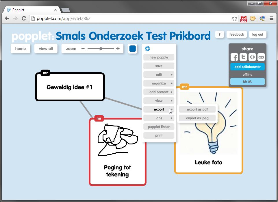 Deze toepassing is de meer hippe versie van de verzameling. Men spreekt niet over kaarten of post-it’s maar over “popples” die verzameld worden in een prikbord genaamd “popplet”. U bent nog mee? Goed. In een popple kan je diverse media plaatsen (tekst / figuren / video / …). Je kan er ook in tekenen wat het dus ideaal maakt voor een online brainstorm waarbij een occasionele schets nuttig is. Verwacht wel niet te veel van de tekenmodus, deze is vrij rudimentair. Bestaande popples kunnen gekopieerd worden, waarna je de relevante zaken kan aanpassen.