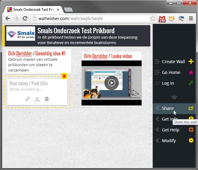 De Wallwisher toepassing blinkt uit in haar eenvoud. Je kan onmiddellijk zonder registratie starten met de aanmaak van een “muur”, waarop je vervolgens informatie kan plaatsen (drag & drop, vrij te positioneren, tekst / video / bestanden / foto / links). De muur zelf kan voorzien worden van een titel, een logo en een aangepaste achtergrond.