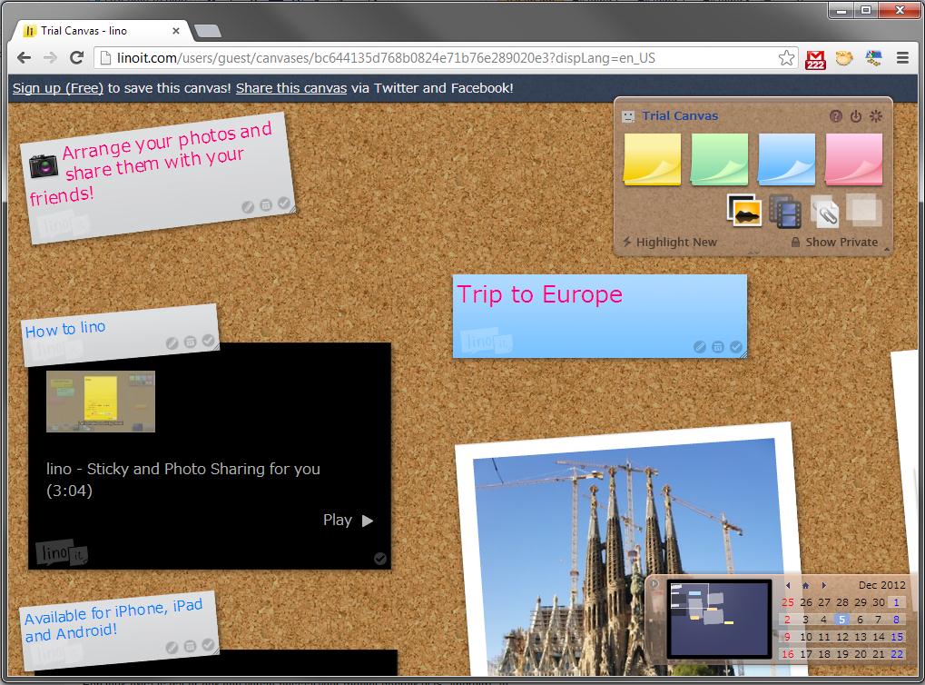 Ook bij Linoit tracht men de werking van een echt prikbord nauwkeurig te benaderen. In deze toepassing kan je post-it’s bijvoorbeeld ook roteren waardoor je de chaos van een echt post-it wall kan benaderen. Het nut hiervan ontgaat me even. Wanneer je niet wil dat men een post-it verplaatst kan je hem vastpinnen met een speldje. Verschillende mediaformaten hebben ondersteuning: video / tekst / figuren / bestanden /… .