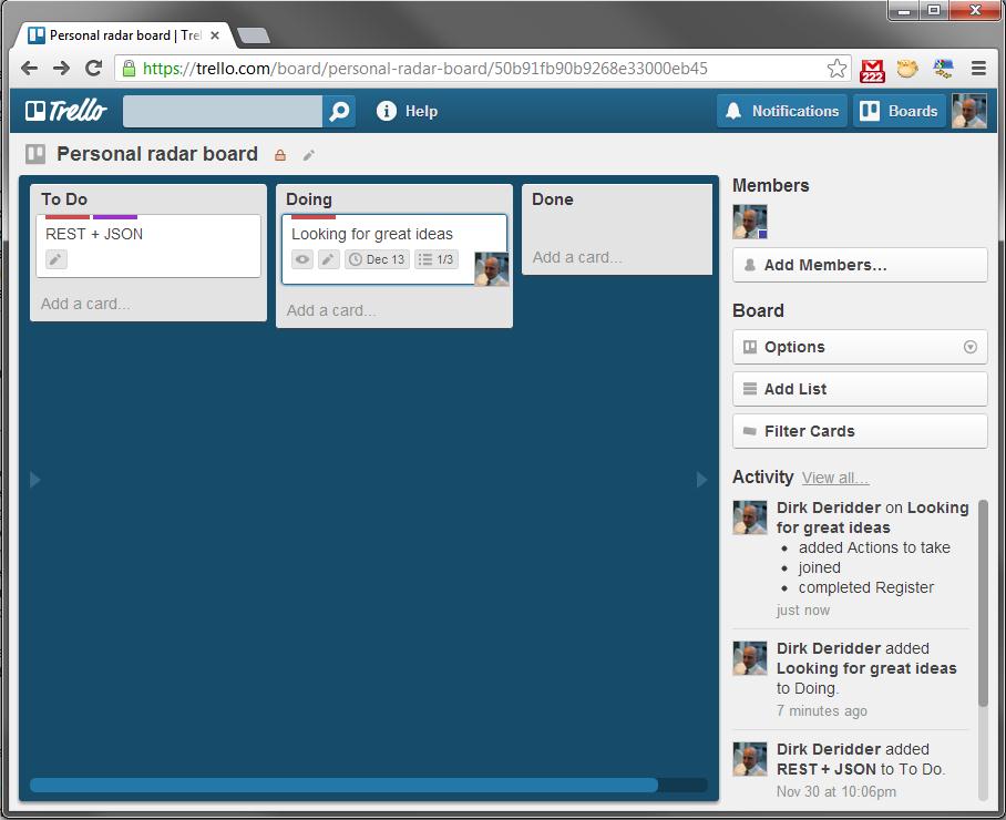 De oorsprong van de toepassing laat zich ook merken bij de initiële set-up van je prikbord (standaard is dit de indeling van een Kanban bord). Dit is volledig aan te passen want je kan kaarten groeperen in lijsten (de kolommen in de screenshot). Kaarten van positie wisselen in een lijst kan met drag & drop (bijv. om de prioriteit aan te geven binnen een backlog van taken), hetgeen ook kan gebruikt worden om ze in een andere lijst te plaatsen (bijv. om de voortgang van een taak aan te geven). Er is ook de mogelijkheid om commentaar te leveren en dit per kaart zodat je een mooie historiek krijgt van de discussie (lijkt sterk op Facebook posts).