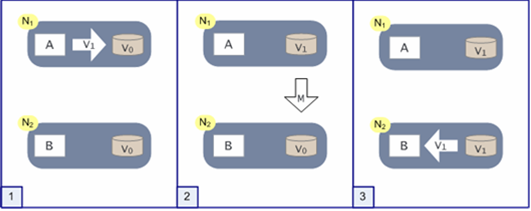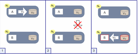 - Proces A schrijft een nieuwe waarde V1 weg naar de databank in node N1