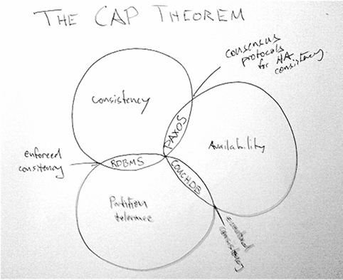 Essentieel is echter te beseffen dat Consistentie, Availability en Partition Tolerance niet op hetzelfde moment gegarandeerd kunnen worden maar afgewogen moeten worden!! In praktijk zal men kiezen voor Eventually Consistent systemen die tijdelijke consistentie problemen tgv. de unavailability van een deelsysteem later zullen opvangen en oplossen op business niveau. Hier moet vanaf het begin van het ontwerp rekening mee gehouden worden!