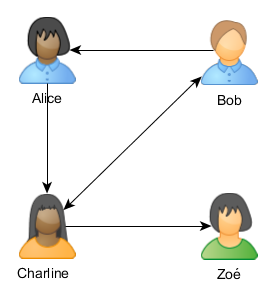 Prenons un exemple simple dans lequel des personnes sont liées par des liens d’amitié (il pourrait s’agir d’ordinateurs et des connexions réseaux, de packages Java et des dépendances…). On veut représenter le schéma suivant, dans lequel une flèche entre Bob et Alice indique que Bob aime Alice, mais que la réciproque n’est pas vraie.