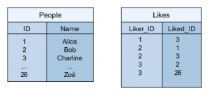 Une représentation classique relationnelle consistera à considérer une table “People”, avec un attribut “Name”, et une clé primaire “ID”, et une table de jointure “Likes”, avec deux clés étrangères Liker_ID, Liked_ID, indiquant qui (Liker_ID) aime qui (Liked_ID). Si l’on veut répondre à la question toute simple “Quelles sont les personnes que Bob aime” (Alice et Charline, en l’occurrence), il faudra écrire la requête suivante :