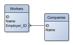 Supposons d’abord que l’on souhaite représenter des travailleurs, et les entreprises pour lesquelles ils travaillent, en supposant dans un premier temps qu’un travailleur ne travaille que pour une seule entreprise. Une modélisation relationnelle simple consistera à utiliser deux tables : une première que nous appellerons “Workers”, et une seconde “Companies”. Typiquement, les deux tables posséderont une “clé primaire” (primary key) permettant d’identifier chaque ligne de façon unique (“ID” dans le schéma ci-contre). Chaque table possédera également des attributs tels que “Name”, ou des identifiants nationaux. Pour savoir quelle entreprise emploie un travailleur en particulier, il conviendra de placer une clé étrangère (foreign key) dans la table Workers, faisant référence à la clé primaire de la table Companies (Employer_id dans notre exemple).
