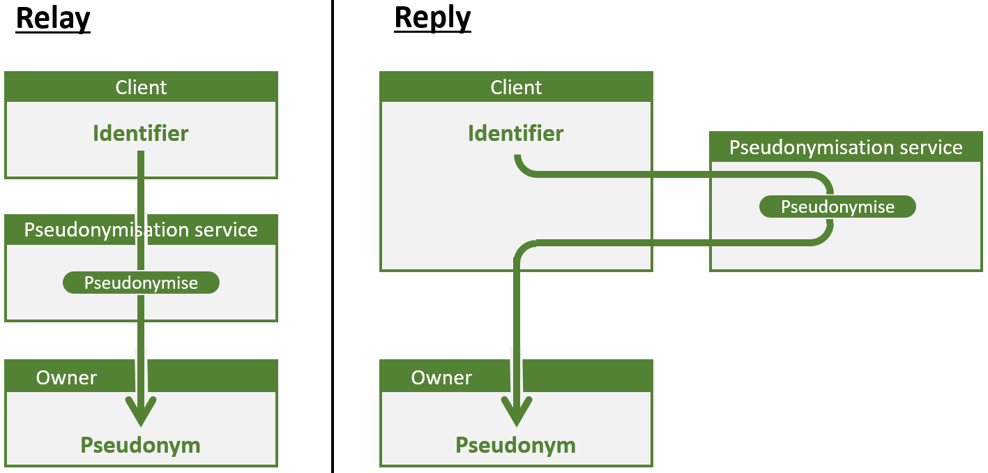 En cas d’utilisation d’un service de pseudonymisation, il convient de déterminer comment il sera possible de communiquer avec lui. À un niveau élevé, on a le choix entre le mode relay (relais) et le mode reply (réponse), illustré dans la figure ci-dessous.