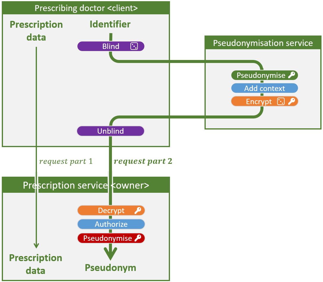Une première mesure est le service de pseudonymisation aveugle, qui est réalisé par les deux opérations violettes (blind et unblind). Il garantit que le service de pseudonymisation ne peut plus voir les pseudonymes et identifiants entrants et sortants, ce qui permet à un service de pseudonymisation curieux de collecter beaucoup moins d’informations et donc d’avoir moins besoin qu’on lui fasse confiance.