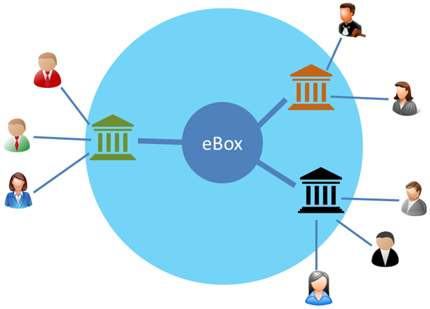 Alice en Bob maken daarbij gebruik van een web client of fat client aangeboden door de hen vertegenwoordigende organisatie. De eBox moet je dus zien als een gecentraliseerd uitwisselplatform voor documenten, waarop verschillende organisaties aangesloten zijn.