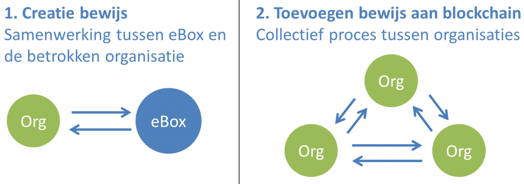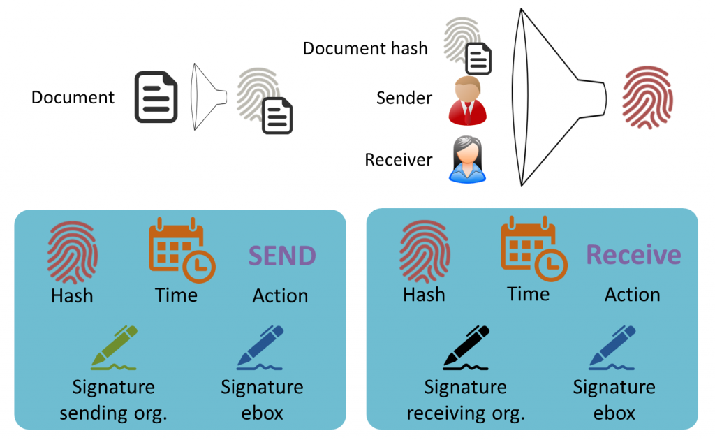 Per document worden twee bewijzen gecreëerd: eentje dat bewijst dat een specifiek document afkomstig van Alice en bestemd voor Bob op een bepaald moment verstuurd werd naar de eBox, en eentje dat bewijst dat het document ook op een bepaald moment ontvangen is. Zo’n bewijs is eigenlijk een akkoord tussen de betrokken organisatie en de eBox. Het is een blockchain-transactie die door de twee partijen ondertekend wordt. De creatie van dit akkoord is een proces tussen slechts de twee betrokken partijen.