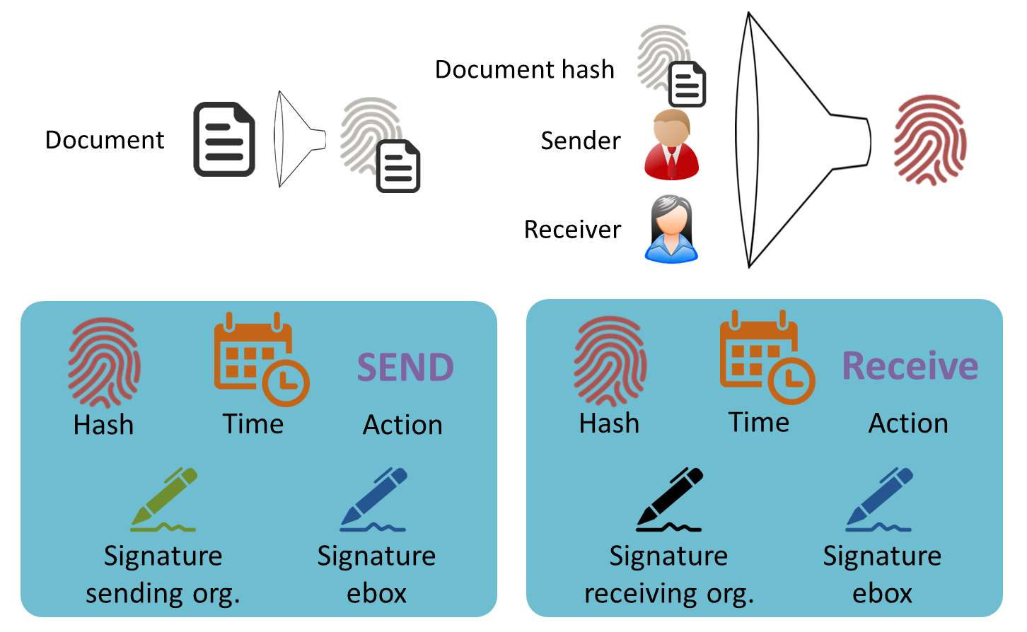 - Wanneer we naast de identifiers van de afzender en de bestemmeling ook nog het originele document hebben, kunnen we bewijzen dat exact dat document, verstuurd door een geïdentificeerde afzender en bestemd voor een geïdentificeerde afzender, op een gekend moment verstuurd of ontvangen is.