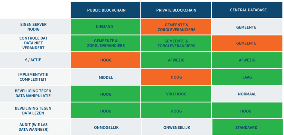 Een tweede voorbeeld vinden we in Nederland. Door de Nederlandse gemeente Stichtse Vest werd bekeken of blockchain een meerwaarde kan bieden bij het aanvragen van een rolstoel. Daarbij zijn, naast de burger, het gemeentebestuur en verschillende zorgaanbieders betrokken. Ze maakten de vergelijking: wat als we dit regelen m.b.v. een publieke blockchain, een afgeschermde (private) blockchain of een traditionele centrale database. Het resultaat is te zien in onderstaande tabel. Een centrale database heeft een lagere infrastructuurkost en complexiteit dan een afgeschermde blockchain. Ook wanneer gebruik gemaakt wordt van een publieke blockchain, is de complexiteit hoger volgens de tabel en zal je moeten betalen per actie. Die prijs fluctueert trouwens constant, afhankelijk van hoe verzadigd het netwerk is, en hoe snel je de actie op de blockchain geregistreerd wil krijgen.
