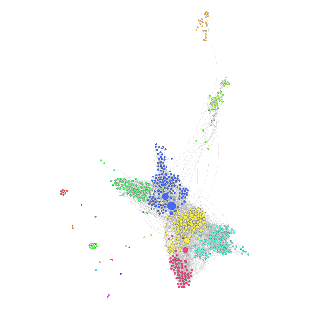 En observant d’abord macroscopiquement, on voit apparaître des “grappes” de nœuds fortement connectés (c’est-à-dire un ensemble de personnes se connaissant mutuellement), certaines connectées au reste, d’autres totalement indépendantes. On trouve également quelques nœuds tout à fait isolés, correspondant à des amis “Facebook” ne connaissant (en tout cas sur Facebook) aucun autre de mes amis. Probablement des gens rencontrés à une occasion très ponctuelle, mais que l’on a perdus de vue depuis. On voit également apparaître tout en haut un groupe d’une vingtaine d’individus qui n’est connecté au reste que grâce à une personne. En regardant le résultat d’un peu plus près, il est frappant de voir à quel point les couleurs utilisées représentent en effet des groupes sociaux “de la vraie vie” : seront groupés par couleur, typiquement, les amis de l’école, de l’université, de la famille, ou de tel ou tel loisir. Des gens partageant donc quelque chose en commun : des études, un hobby, une famille, une ville d’origine, peut-être des convictions politiques ou religieuses, …