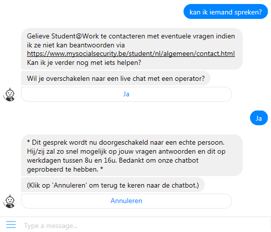 Overschakelen naar live chat was in het begin niet voorzien, met als gevolg dat alle conversaties van dichtbij moesten opgevolgd worden om de student in kwestie via live chat verder te helpen. Die taak werd opgenomen door de mensen van de RSZ Front Office. Aangezien één van de doelen van de chatbot net is om hun taak te verlichten, hebben we prioritair werk gemaakt van de human hand-over functie. Nu hebben de mensen onmiddellijk zicht op de gebruikers die een live chat vragen, zonder de volledige lijst met conversaties te moeten doorworstelen.