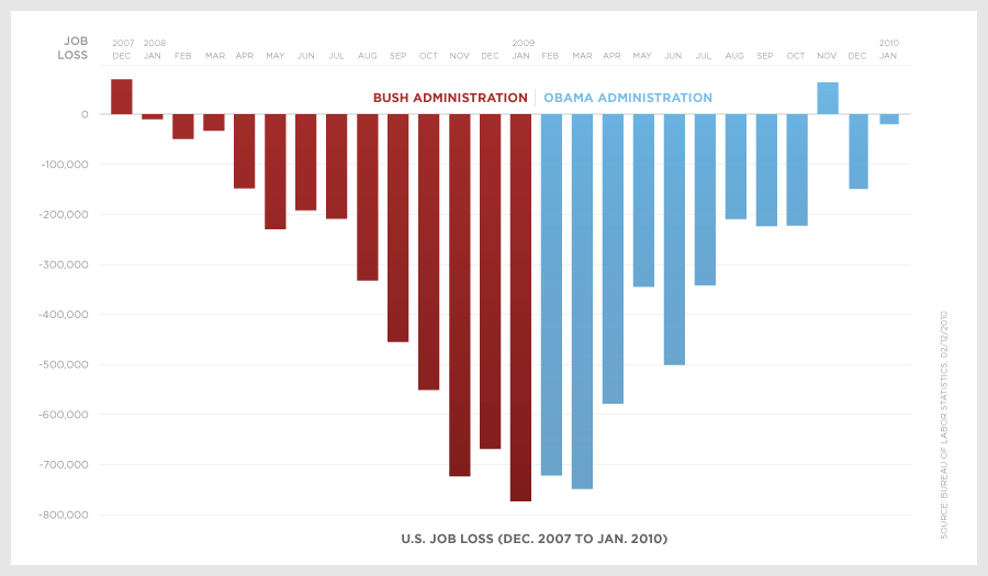 On peut d’abord remarquer trois stratagèmes simples utilisés dans ce graphique pour accentuer le point de vue de l’auteur. Le premier a déjà été présenté avec l’exemple du parti socialiste français ci-dessus, et consiste à “retourner” le diagramme en bâton. On a donc quelque chose en décroissance sous l’administration Bush, qui accentue l’aspect dramatique, et en croissance sous celle d’Obama, pour accentuer le sentiment de progrès et de rétablissement. Par ailleurs, on voit un bleu clair, lumineux, pour la partie d’Obama et un rouge foncé, sombre pour celle de Bush. Ce n’est certainement pas innocent. Enfin, la légende indique le graphique va de 2007 à 2010. Si l’on ne fait pas attention aux mois, on pourrait penser que le graphique couvre 3, voire 4 ans, et qu’il s’agit donc d’une progression durable. Or le graphique concerne essentiellement 2008 et 2009 (décembre 2007-janvier 2010), soit à peine plus de deux ans.