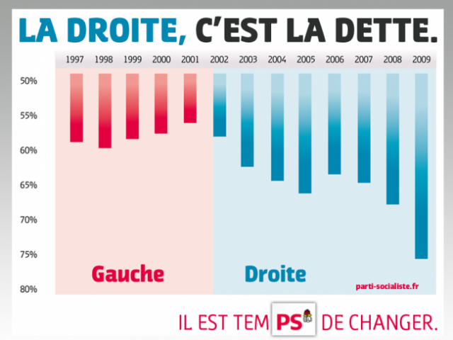 L’exemple suivant a été emprunté au parti socialiste français. PS-detteIl met en avant une épouvantable évolution de la dette lorsque la droite s’est trouvée au pouvoir entre 2002 et 2009. Première chose intéressante à constater : alors qu’en général on représente la base d’un diagramme en bâtons en bas, les “communicants” du PS ont choisi ici de l’inverser. On observe donc une “montée” (quelque chose d’intuitivement positif) pour la gauche, et une “baisse” pour la droite (intuitivement négative).