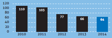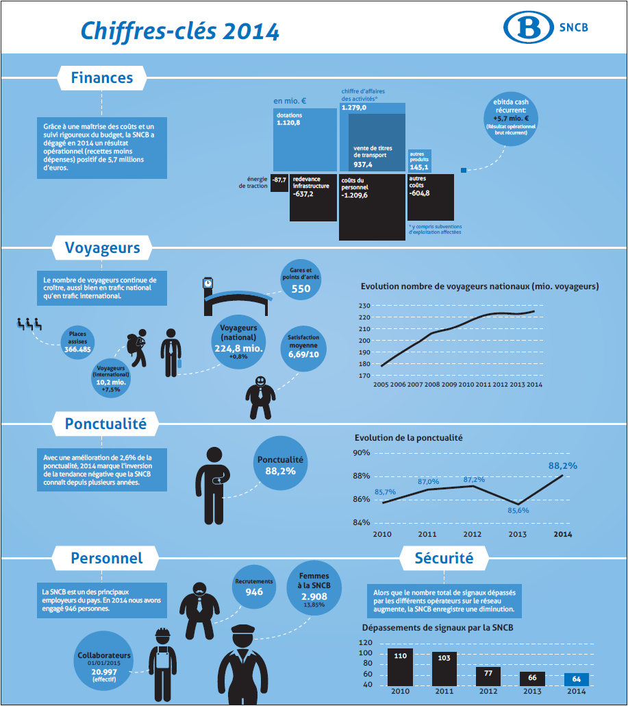 SNCB-secuPrenons par exemple l’illustration ci-contre, issue d’une infographie de la SNCB, parue dans le journal Métro du mercredi 10 juin 2015. On y montre la baisse du nombre de dépassements de signaux entre 2010 et 2014. Ils sont passés de 110 à 64, soit une baisse de 41.8 % ((110-64)/110). Par contre, visuellement, grâce au/à cause du fait que l’axe vertical démarre à 40 et non en zéro, la baisse est de 70 (110-40) à 24, soit 65.7 %. Notre cerveau enregistre une baisse drastique de quasiment un facteur 3. On a donc un lie factor de 65.7/41.8, soit 1.54. L’effet visuel est dès lors 54% plus important que les données à représenter 2SNCB-secu-corrUne version “corrigée” du graphique vous est présentée ci-contre. La diminution semble nettement moins impressionnante !
