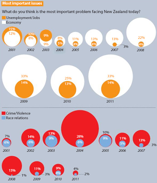 SundayStarTimesLorsque l’on mélange ces deux sources de confusions, on arrive à une infographie telle que celle présentée dans le “Sunday Star Times” du 12 février 2012 (reprise sur www.statschart.org.nz). Outre le fait qu’il existe des façons plus adaptées de représenter l’évolution de deux mesures dans le temps, on voit par exemple que le petit cercle orange de 2009 (14 %) a une surface 5.5 plus petite que le cercle dans lequel il est inscrit (33 %), soit une augmentation de surface de 450%, pour représenter en réalité une augmentation de 135% (14% -> 33%). Cela nous donne donc un lie factor de 3.32. Étant la relation quadratique entre diamètre et surface d’un cercle, le lie factor sera en fait différent pour chacun des graphiques (et d’autant plus important que le ratio dans les données est important). Le fait qu’un cercle soit placé devant l’autre est également trompeur : dans le premier item de la seconde infographie, la partie rouge est à peine visible, alors qu’elle représente une quantité supérieure à la partie bleue.