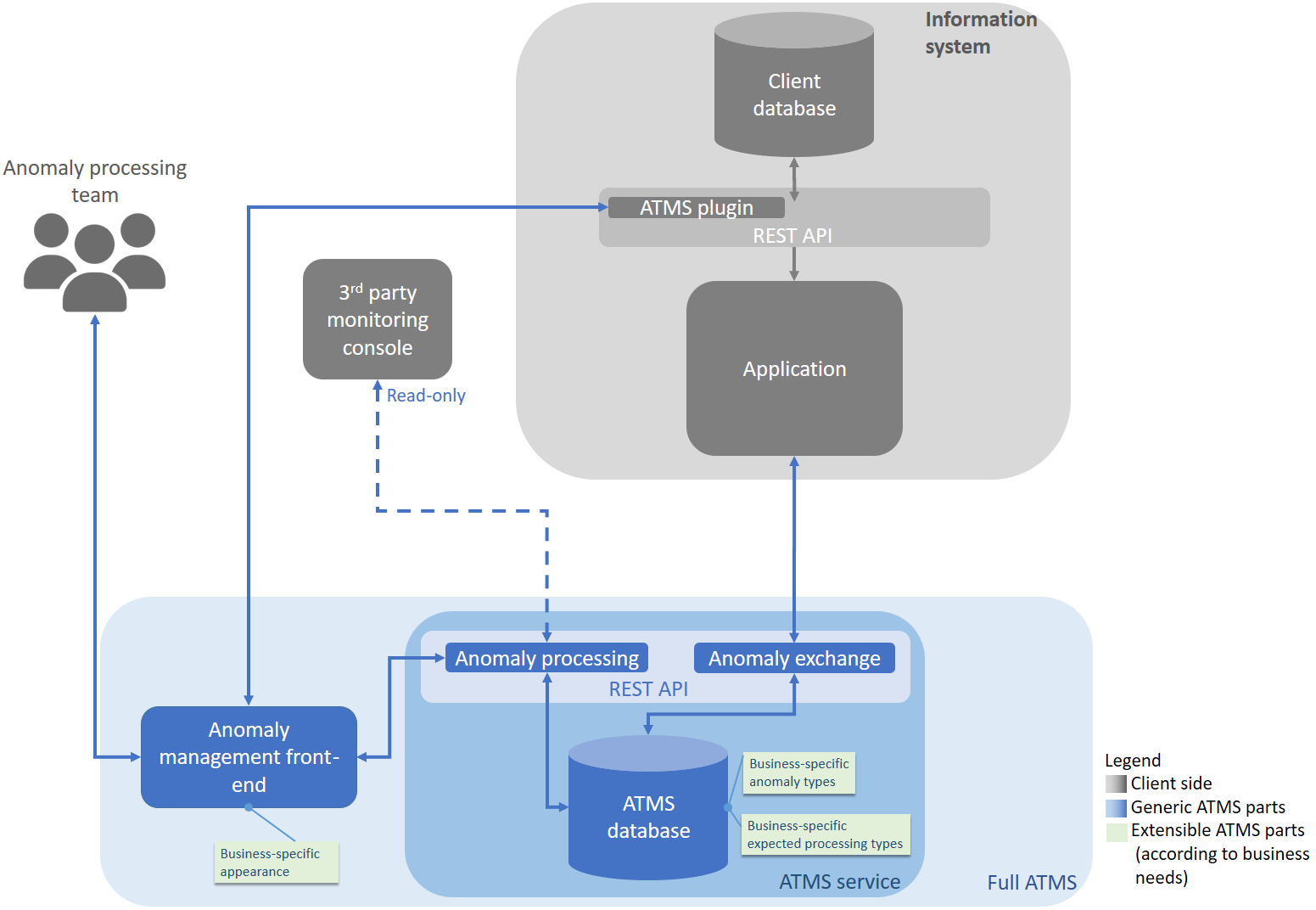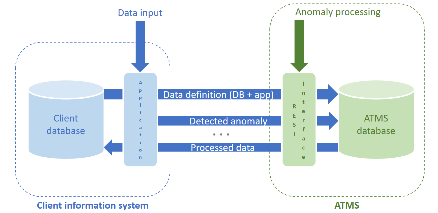 Met het oog op deze rijke interne structuur biedt ATMS niettemin eenvoudige technische interfaces, waarmee de toepassing bijvoorbeeld anomalieën die in het systeem binnenkomen kan registreren en het resultaat van de verwerking van een anomalie door een agent kan ophalen.