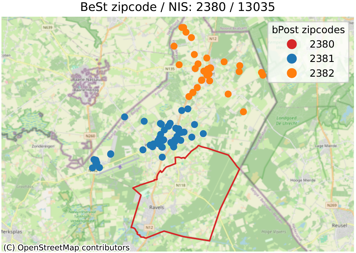 - In de tweede vergelijken we de grenzen van de postcodes gedefinieerd door bpost (de Belgische postdienst) met de postcodes van adressn uit BeSt Adress;