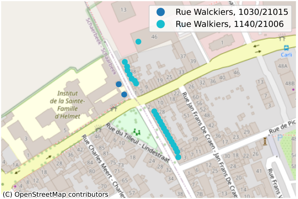 Voor elk adres (straat, postcode, nummer) hebben we gecontroleerd of de coördinaten die bij de bussen horen niet abnormaal ver uit elkaar liggen. In de overgrote meerderheid van de gevallen hebben de verschillende bussen met hetzelfde nummer allemaal dezelfde coördinaten, maar dit is niet altijd het geval.