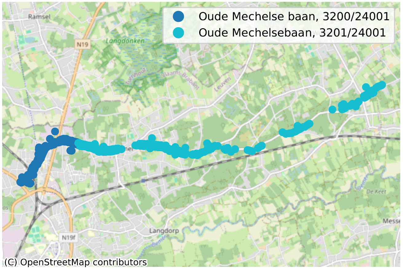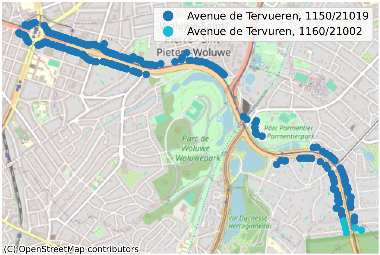 Om dit te illustreren nemen we twee voorbeelden, weergegeven in de figuur hieronder. Het eerste voorbeeld (Abdijstraat, 41 te 9140 Stekene) toont aan dat het basisadres (Abdijstraat, 41, voorgesteld door een ‘/’) zich op 11 kilometer van Abdijstraat, 41 bus 12 bevindt. We vonden bijna honderd zeer vergelijkbare voorbeelden.