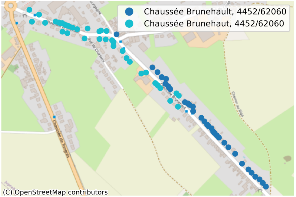 Voor deze analyse gaan we een ‘klassieke’ benadering op basis van karakterketen combineren met een geografische benadering. We starten met het identificeren van de lijst van alle paren van aangrenzende straten (d.w.z. de ene heeft een adres op minder dan 100 meter van de andere). Vervolgens controleren we op kleine verschillen in straatnamen. We zien meestal twee situaties: