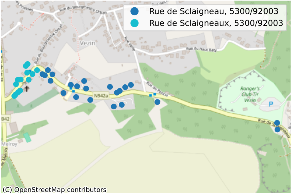 Er zijn ook een paar fout-positieven: ‘Rue de Mars’ vs ‘Rue de Mai’. We schrappen namen uit onze vergelijkingen die identiek zijn op een geïsoleerde laatste letter na (“Hensellaan A” vs “Hensellaan B”), evenals namen waarbij slechts een cijfer verandert (‘5de Zijweg’ vs ‘6de Zijweg’).