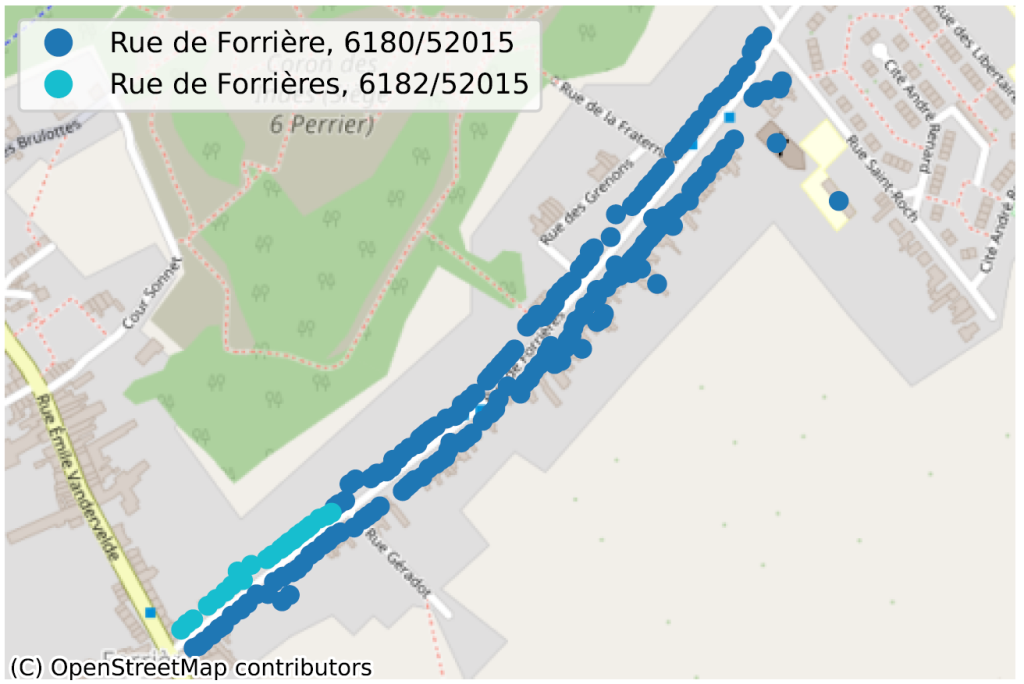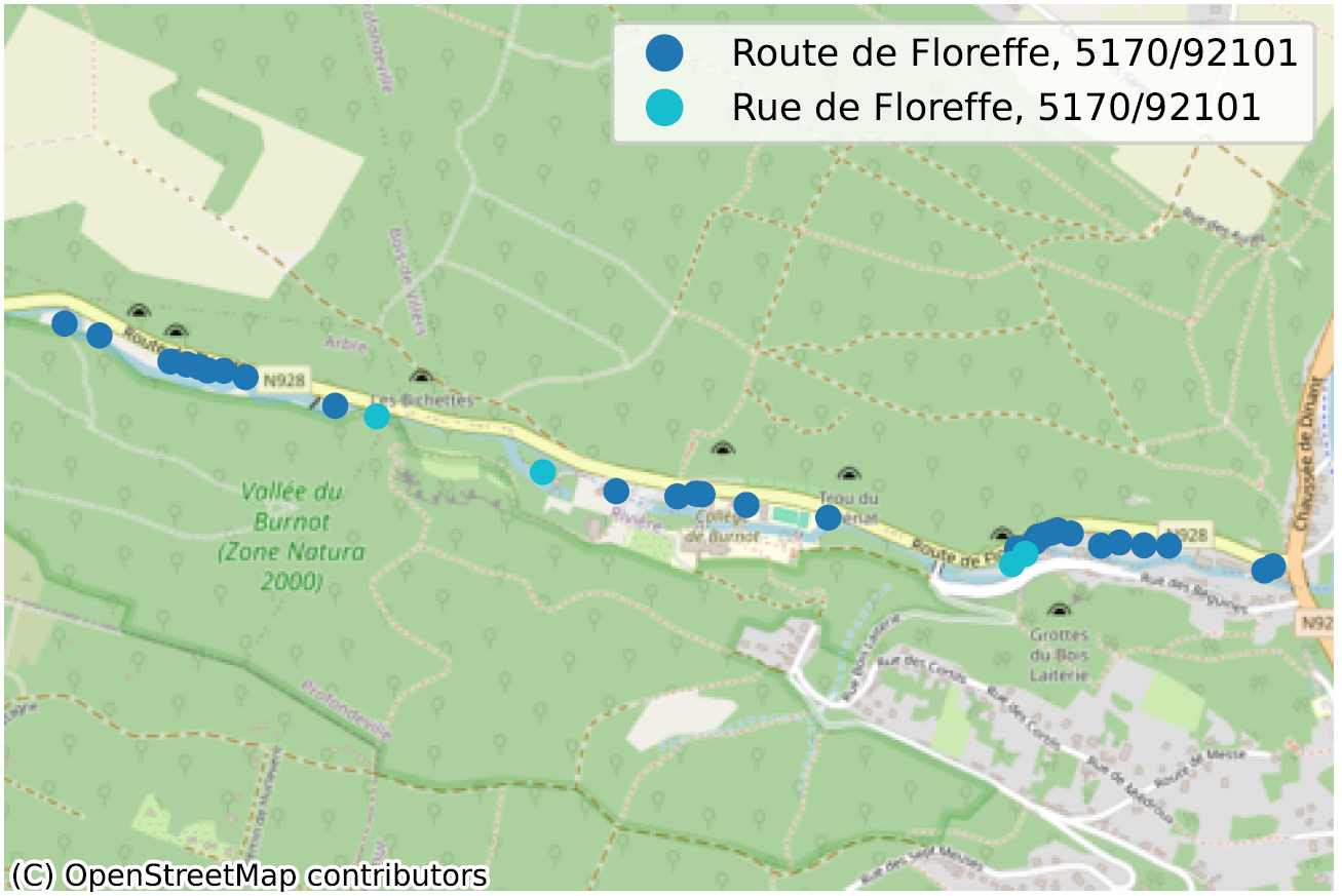 De situatie waarin, binnen dezelfde gemeente, soms zelfs voor dezelfde postcode, twee straatsecties niet op dezelfde manier worden gespeld, is een duidelijke indicatie van een probleem met de kwaliteit van de gegevens. We hebben tientallen van dergelijke gevallen geïdentificeerd, voornamelijk in Wallonië, en noemen er hier slechts enkele ter illustratie.
