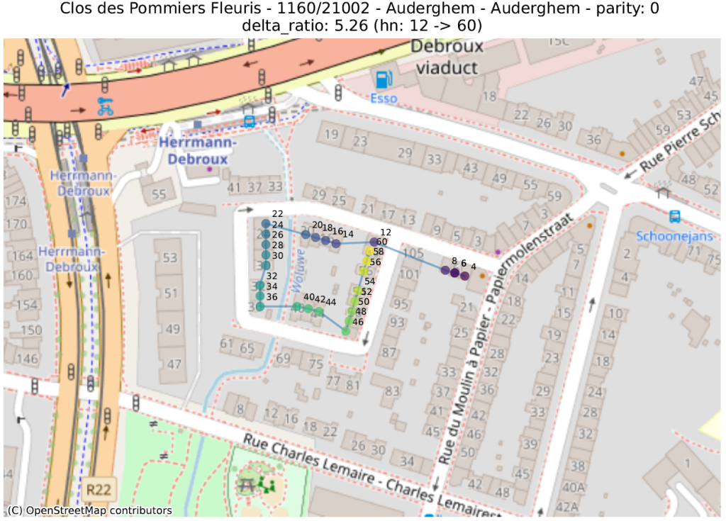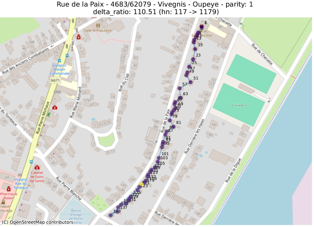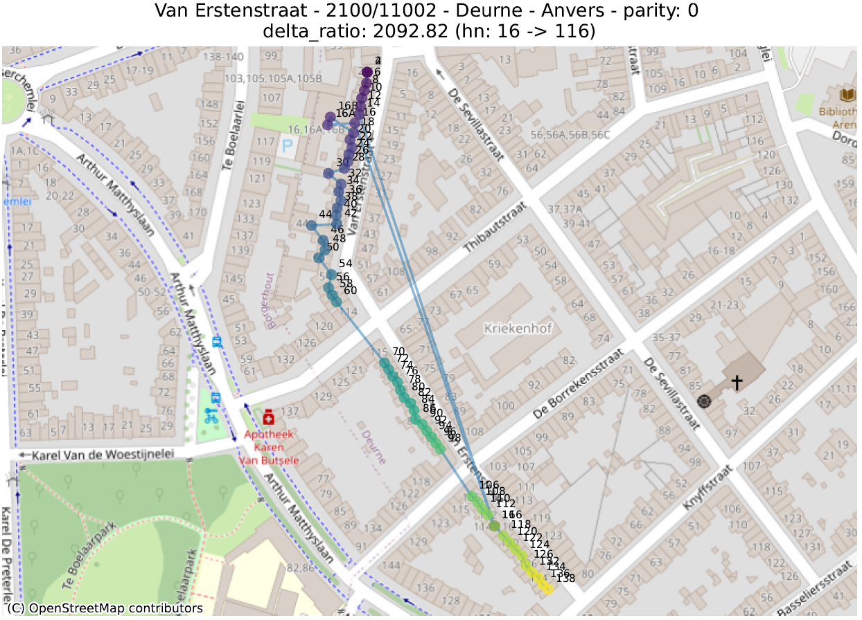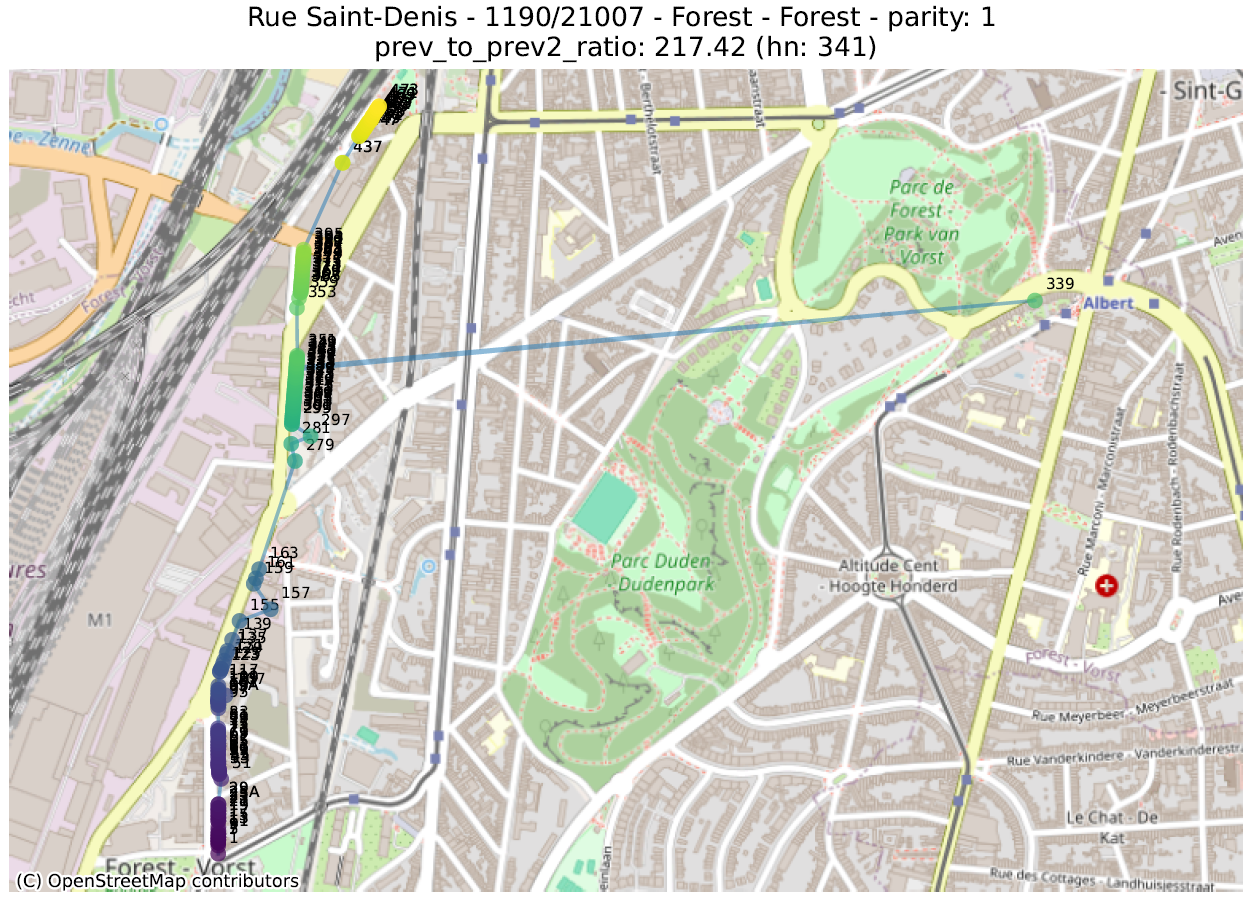 Hier bekijken we de geometrische vorm die bestaat uit de opeenvolging van punten van adressen met dezelfde pariteit, voor dezelfde straat en postcode. Vervolgens berekenen we een aantal metrieken op deze lijn, ervan uitgaande dat de hoogste waarden duiden op een afwijking.