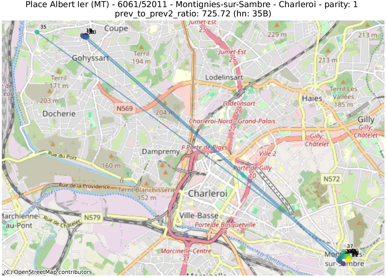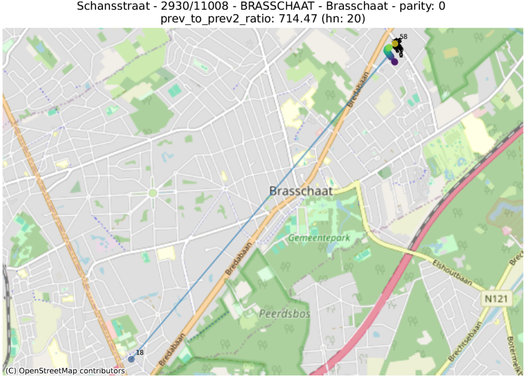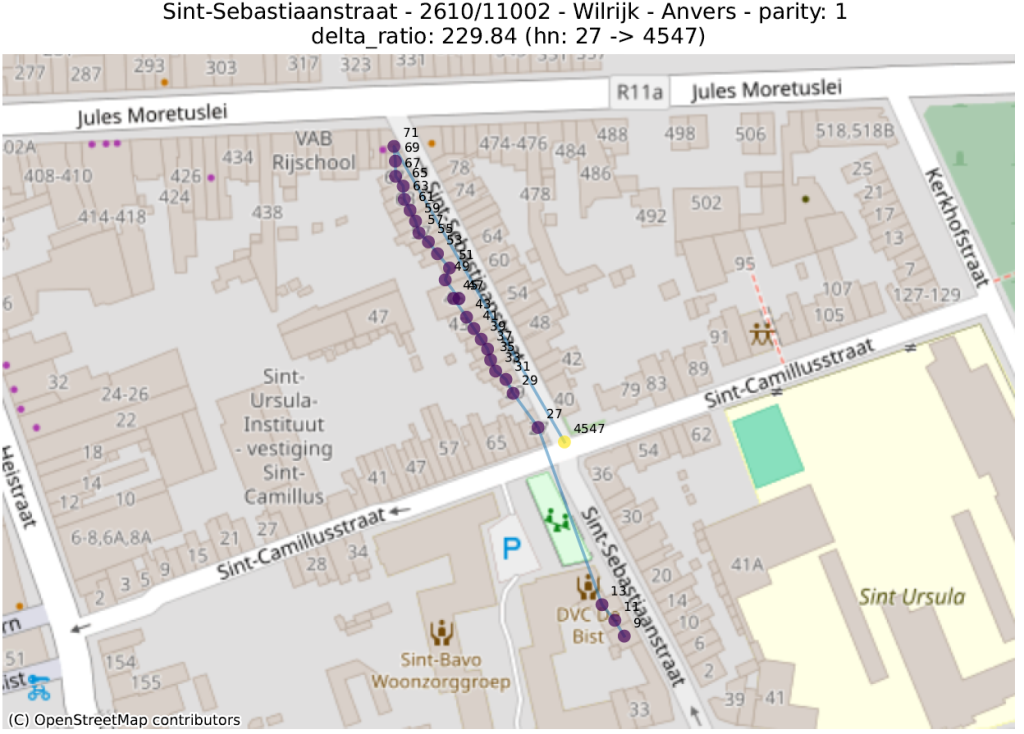 - delta_ratio: voor elk paar adressen in dezelfde straat en van dezelfde pariteit berekenen we de verhouding van het verschil tussen het numerieke deel van de huisnummers en de afstand. Een hoge waarde geeft aan dat twee huizen met zeer verschillende huisnummers abnormaal dicht bij elkaar liggen. Dit is vaak te verklaren door twee verschillende fenomenen: