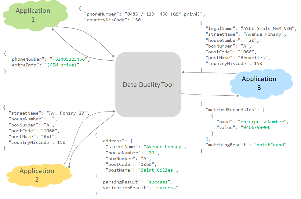 La suite de fonctionnalités Batch, fondamentale pour les gros volumes de données, est maintenant complétée par une REST API développée en 2020 et en cours de standardisation en 2021 (Figure 4). Celle-ci permet de transformer des valeurs en vue de les conformer à un standard défini (“data cleansing”), de détecter des incohérences ou de dédoublonner les données avant leur écriture dans la base et même, si besoin, de conditionner cette écriture par la réussite des opérations qui la précèdent. L’outil implémente ainsi effectivement un pare-feu de données complémentaire au système de détection d’anomalies déjà mis en place par l’application. L’API est par exemple utile pour la standardisation de numéros de téléphone, la validation d’adresse ou la vérification de l’existence de duplicats dans une base de données avant l’insertion d’un nouveau record. L’API dataQualityImprovment est documentée sur l’ict-reuse, au fil de son enrichissement.