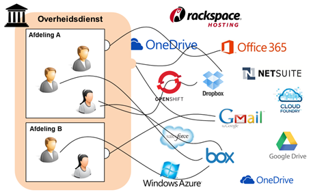 Zowel ondernemingen als overheidsdiensten hebben moeite om om te gaan met de relatief recente situatie waarbij de werknemers en delen van het (overheids)bedrijf zonder toelating gebruik maken van allerlei diensten in de publieke cloud voor professionele doeleinden. Op het eerste zicht is een dergelijke oplossing snel en goedkoop, maar toch krijgen we al gauw een onoverzichtelijk kluwen, zoals geïllustreerd in onderstaande figuur, wat ook wel een spaghettiarchitectuur genoemd wordt.