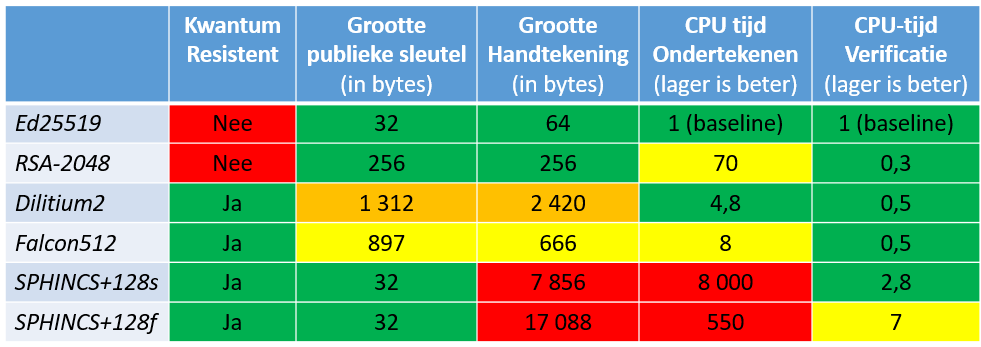 De geselecteerde algoritmes luisteren naar de namen Dilithium, Falcon en SPHINCS. In onderstaande tabel worden deze vergeleken met RSA-2048 en Ed25519, wat hedendaagse algoritmes zijn voor digitale handtekeningen gebaseerd op respectievelijk RSA en op elliptische krommen. In onderstaande tabel hebben alle algoritmes een veiligheidsniveau van ongeveer 128 bits, met uitzondering van het nog steeds erg populaire RSA-2048, wat eerder op 112 bits security gemapt moet worden. SPHINCS+128s en SPHINCS+128f verschillen slechts in de gekozen parameters; respectievelijk worden de handtekeninggrootte en de ondertekentijd geminimaliseerd.