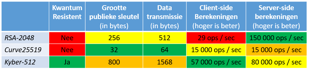 Samengevat heeft Kyber aanzienlijk grotere publiek sleutels, moet meer informatie uitgewisseld worden en is het computationeel erg efficiënt.