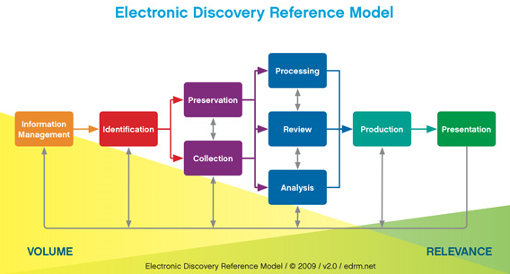 Il s’agit donc de pouvoir retrouver des données électroniques suite à une demande d’un juge ou pour prouver un élément devant les tribunaux. Pour ce faire, il faut mettre en place une démarche globale, qui a fait l’objet d’un modèle de référence (http://www.edrm.net/) comportant 9 étapes :