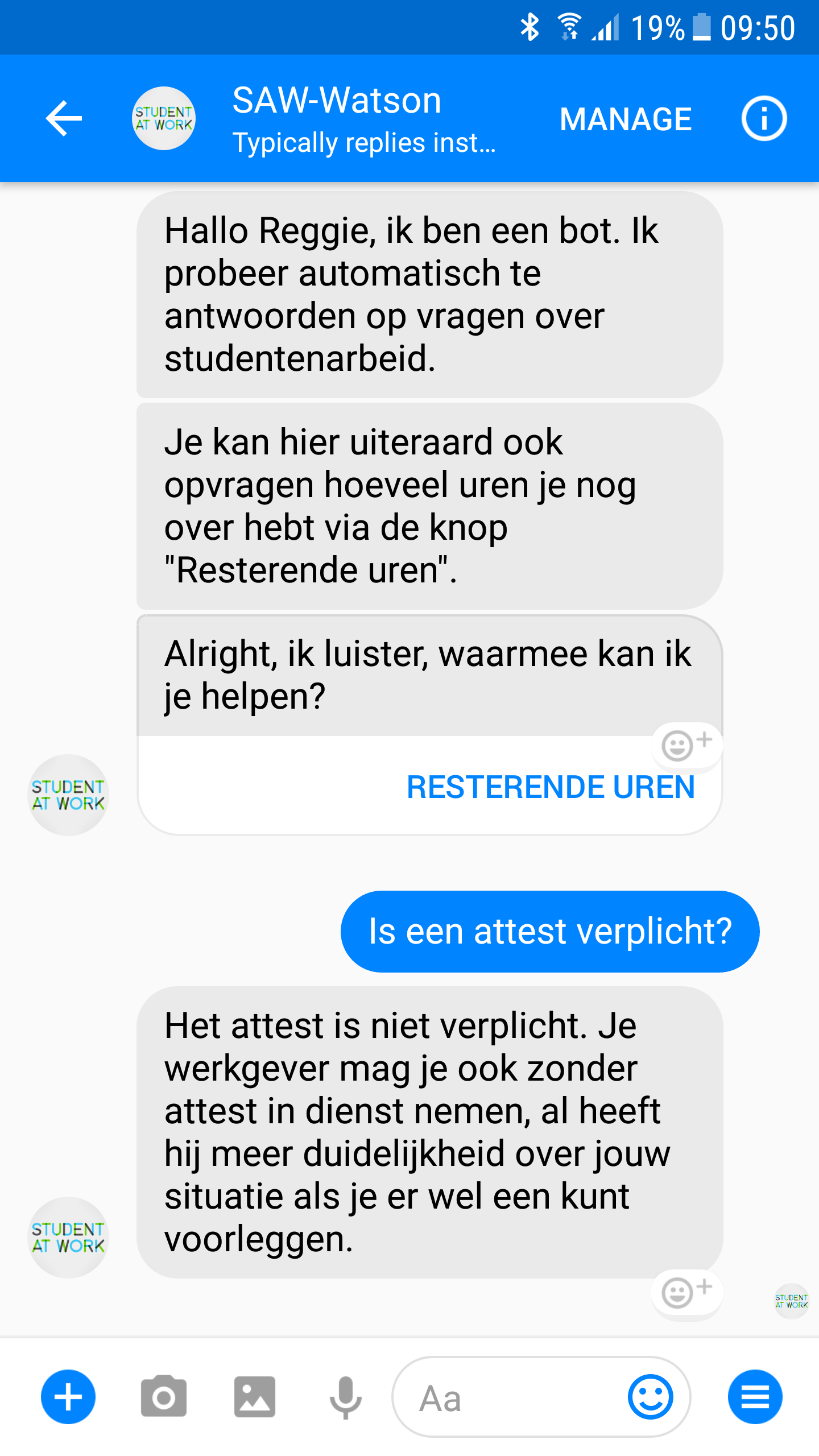 Als een gebruiker aan de slag gaat met de chatbot in Messenger wordt er een introductieboodschap gegeven. Daarin wordt geschetst wat je als gebruiker kan verwachten van de bot. Naast het stellen van een vraag in vrije tekst wordt er ook de mogelijkheid gegeven om het contingent op te vragen via een knop die leidt naar de bestaande webtoepassing van Student at work. Het contingent is het resterend aantal uur dat je mag werken tegen verminderde sociale bijdragen; als jobstudent heb je zo 475 uur per jaar. Technisch gebeurt dit via een webview zodat het lijkt alsof men de Messenger omgeving niet verlaat. Het toevoegen van een knop voor het opvragen van de resterende uren zet deze topvraag extra in de verf.