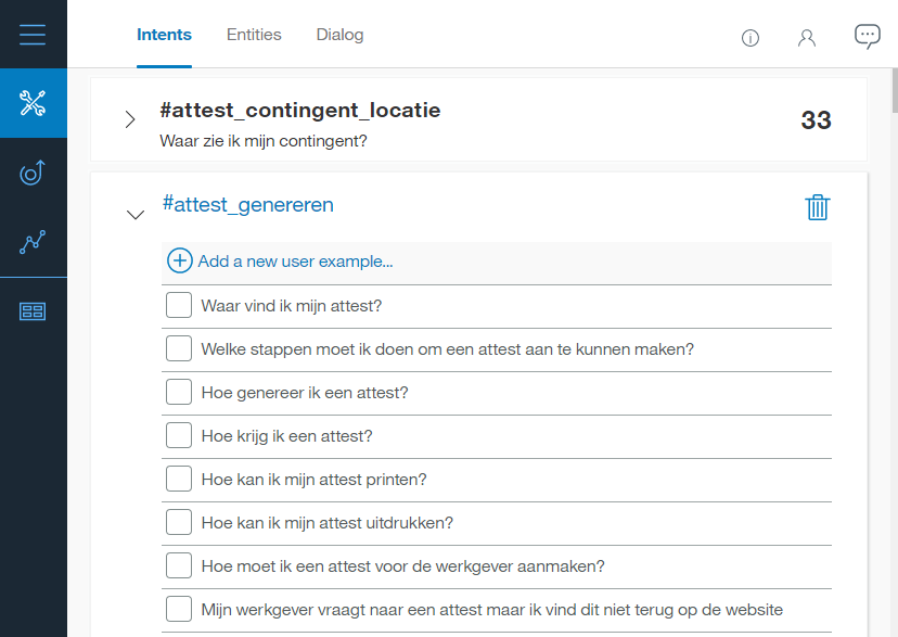 Uiteindelijk zijn we terecht gekomen bij IBM Watson Conversation waar Nederlands wel ondersteund wordt, weliswaar in beta. Een kernconcept bij Watson Conversation is een intentie (intent): een vraag van een gebruiker of een doel dat hij/zij wil bereiken. In ons geval komt elke vraag uit de FAQ-lijst overeen met één intent. De vragen en intents kunnen geïmporteerd worden vanuit een CSV bestand, de antwoorden niet. De enige mogelijkheid om antwoorden te importeren is om een volledig JSON bestand te importeren met zowel de vragen, intents als de antwoorden. In ons geval hebben we de antwoorden manueel ingegeven en één op één gekoppeld aan de intents.