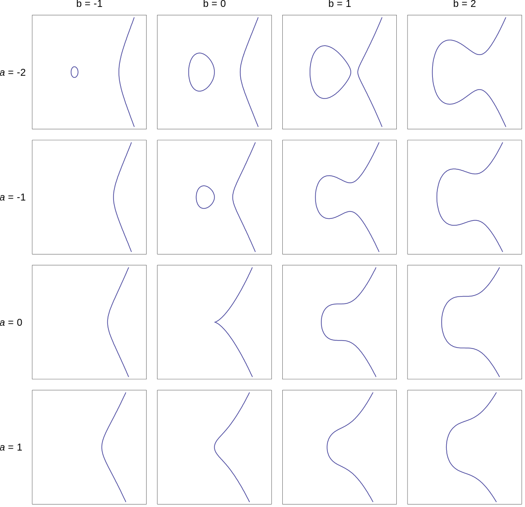 où a et b sont les coefficients de la courbe et appartiennent à K. La figure ci-dessous illustre les différentes représentations graphiques d’une courbe elliptique avec son équation simplifiée, dépendamment des valeurs de a et de b.