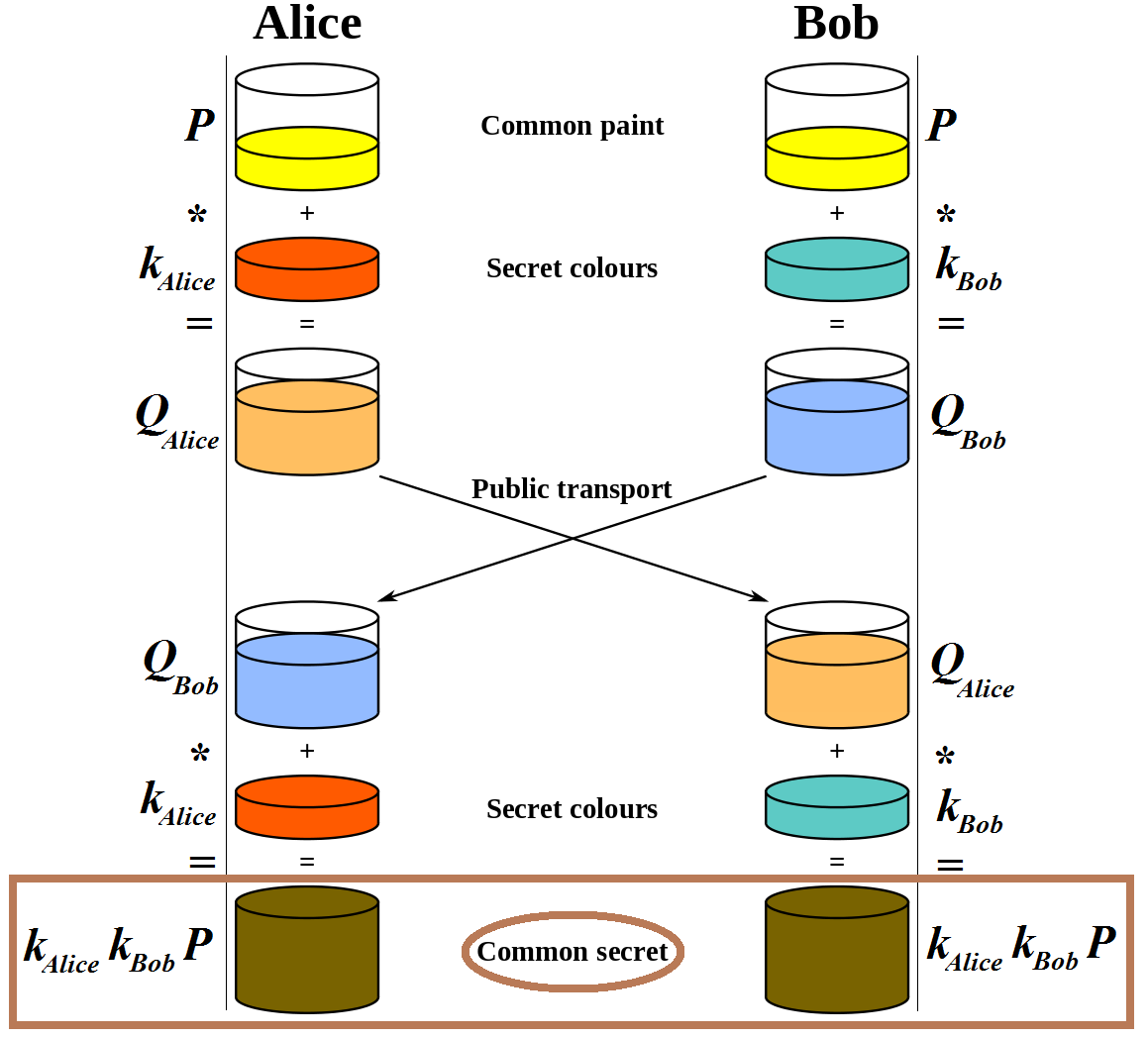 Attardons nous un peu sur le protocole ECDH, car il est un exemple très pédagogique de l’utilisation des courbes elliptiques. En réalité, ce protocole est une variante du protocole de Diffie-Hellman (du nom de ses inventeurs), à l’origine basé sur le groupe multiplicatif des entiers modulo p, avec p étant un nombre premier. Le protocole original a été l’un des premiers exemples d’échange de clés dans le domaine de la cryptographie. Datant du milieu des années 70, le protocole de Diffie-Hellman permet à deux entités (Alice et Bob), qui ne se connaissent absolument pas, de se mettre d’accord sur un secret partagé, même en utilisant un canal de communication non sécurisé (i.e. qui peut être écouté par des personnes malveillantes). Le secret partagé peut ensuite être utilisé pour chiffrer la communication suivante entre Alice et Bob.
