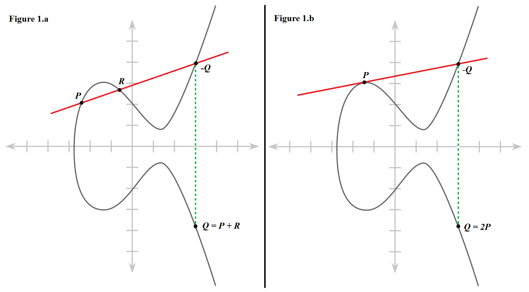Pour définir l’addition Q = P + R, il faut tracer une droite reliant P et R. Cette droite (en rouge sur la figure 1.a) coupe la courbe elliptique en un troisième point appelé -Q (expliquer ce que représente ce point -Q est hors du contexte simplifié de cet article). Le symétrique de ce point par rapport à l’axe des abscisses (obtenu en suivant la droite pointillée verte sur la figure 1.a) est le résultat Q de cette addition.
