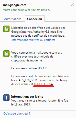 Un exemple concret (ci-contre) qui joint l’utilisation de ECDH et de ECDSA est le certificat SSL de certains sites web, tels que celui de Gmail. Notons que pour ce dernier, le protocole d’échange de clés est ECDHE, une variante de ECDH où les secrets choisis par les deux entités communicantes sont éphémères (d’où le “E” rajouté à l’accronyme), c’est-à-dire utilisés que temporairement, par exemple pour une seule session de communication. Ce choix permet ainsi de fournir une confidentialité persistante (forward secrecy en anglais) : même si un adversaire retrouve les secrets éphémères d’une session compromettant ainsi les communications correspondantes, il ne sera pas capable de compromettre les communications d’une session antérieure.