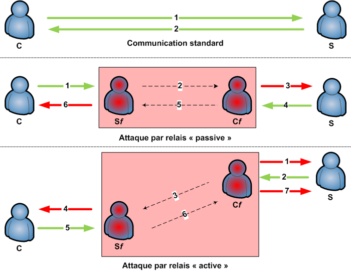 Schémas de principe d’une attaque par relais.