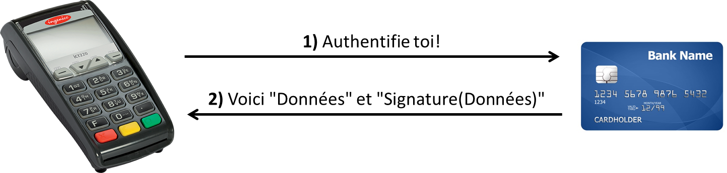 Le terminal va ensuite vérifier que la signature est correcte. - Vérification du code PIN. Le terminal demande ensuite au client de rentrer son code PIN, et transmet en clair le résultat à la carte. Cette dernière va simplement comparer la valeur reçue avec la valeur stockée : si les deux valeurs sont identiques, alors la carte répond OK au terminal.