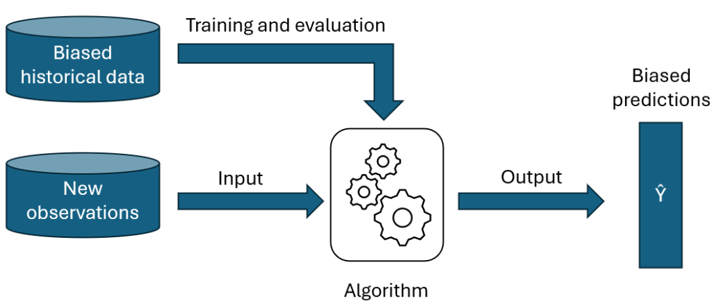 Comme nous en avions déjà discuté dans un précédent article de blog, un biais peut avoir plusieurs sources. Il peut par exemple s’agir d’un problème de design de l’algorithme en lui-même, d’un souci de sous-représentation d’un groupe dans les données d’entrainement, ou de données historiques biaisées par du racisme/sexisme présent dans la société [1]. Dans le cadre de cet article, nous nous concentrerons sur le cas où le problème vient des données et non pas du modèle en lui-même, à savoir lorsque le modèle apprend sur des données biaisées et reproduit ensuite ce biais dans ses prédictions.