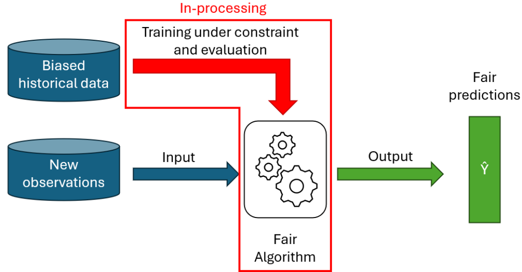 Ces méthodes consistent à modifier directement le modèle prédictif en lui-même, de sorte que ses prédictions soient équitables. Cela peut par exemple se faire en ajoutant un terme de régularisation sur la fonction objectif de l’algorithme, ou en lui ajoutant des contraintes de fairness.