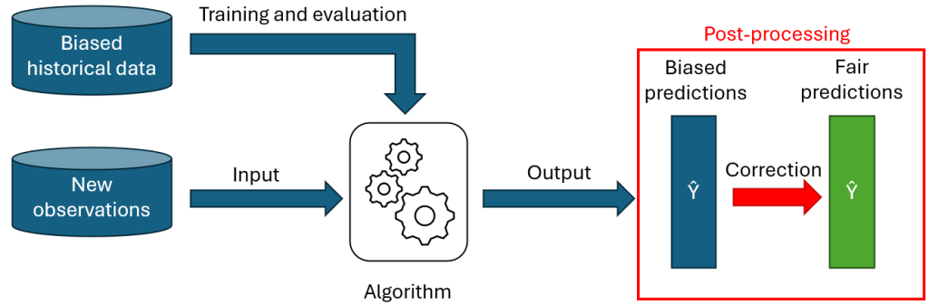 Pour la dernière approche, on ne touche pas au modèle ou aux données historiques, on va simplement appliquer un ajustement aux prédictions fournies par le modèle de sorte à satisfaire les contraintes de fairness. Un algorithme de post-processing va donc généralement soit modifier les probabilités d’appartenance aux classes prédites par le modèle, soit directement modifier les décisions (classifications finales) pour certaines observations.