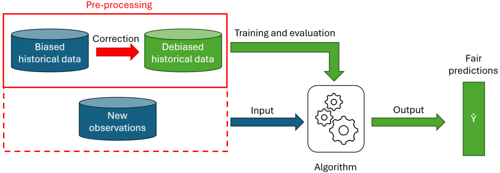 La figure 2 montre l’ajout d’équité via une approche pre-processing. Comme visible sur le schéma, le pre-processing ne s’applique pas toujours nécessairement aux nouvelles données. Certaines méthodes (e.g. rééchantillonnage, relabeliser) ne demandent que de modifier les données d’entrainement, pour éviter que l’algorithme n’apprenne le biais. Par contre, certains algorithmes (e.g. representation learning) nécessitent aussi de modifier les nouvelles observations à prédire.