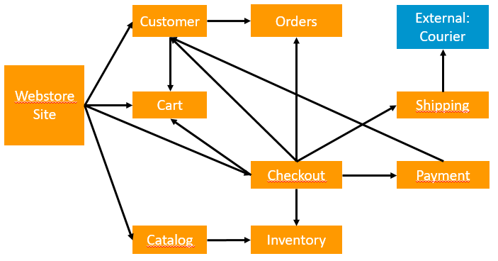 Laten we het voorbeeld in Figuur 1 bespreken: Het betreft een webwinkel, opgebouwd via een microservices aanpak, waarbij alle microservices met elkaar communiceren via hun APIs. In de figuur staan 14 point-to-point afhankelijkheden; we zullen deze overlopen aan de hand van een typisch scenario.
